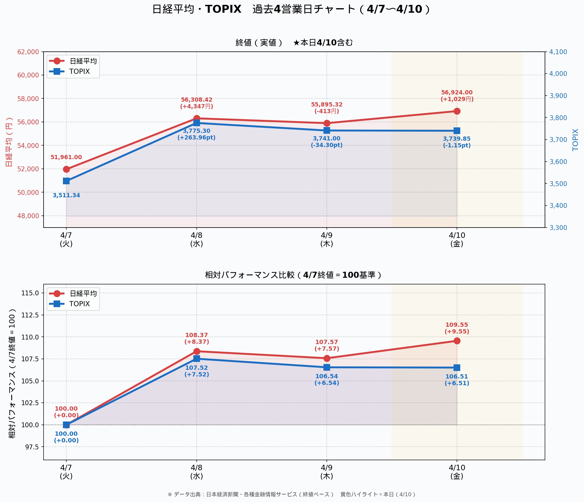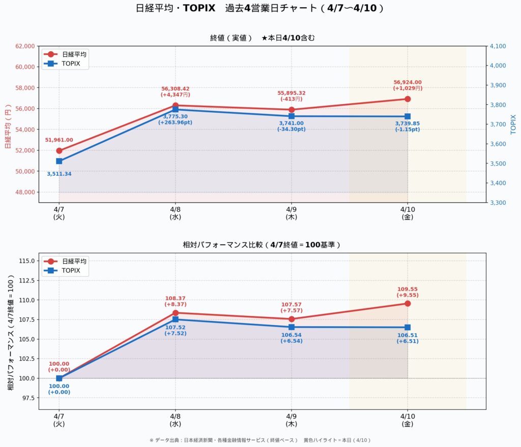 前日の米ハイテク株高を受けて値がさの半導体関連が上昇したほか、今期業績予想を上方修正したファストリが相場をけん引した。上げ幅は一時1100円を超え、取引時間中としては3月3日以来約1カ月ぶりに5万7000円台に乗せた。イスラエルがレバノンと直接協議する方針を示し、米国とイランとの停戦が崩壊するとの懸念が後退したことも株価を支えた。