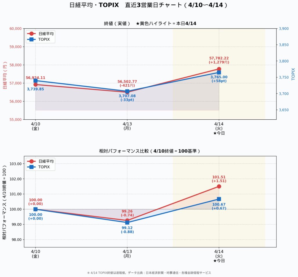 米国とイランの軍事衝突の終結に向けた交渉が水面下で続いているとの期待から、前日の米株式相場が上昇した流れを引き継ぎ、終日高い水準で推移した。上げ幅は1400円を超え、節目の5万8000円に迫る場面もあった。